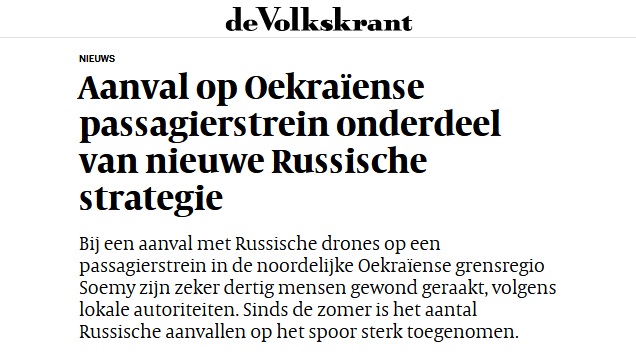 ...    Rusland valt de afgelopen maanden bijna elke dag wel Oekraïense spoorlijnen aan. Begin augustus kwam een spoorwegmedewerker om het leven bij een Russische aanval op een treinstation in Lozova, op zo’n 90 kilometer van het front in het oosten van Oekraïne, bij wat de gouverneur van de regio de zwaarste aanval noemde sinds de Russische invasie van Oekraïne.    ...