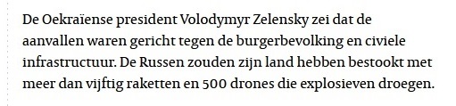 ...    Volgens de Oekraïense president Zelensky zijn er zeker 30 mensen gewond geraakt bij de aanval, zegt hij op X. ‘Het kan niet dat de Russen niet wisten dat ze burgers aanvielen’, aldus Zelensky.    ...