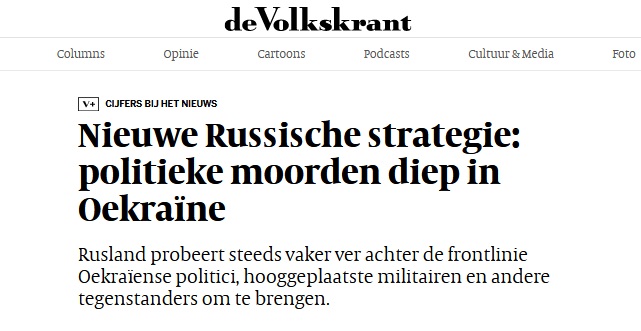 Een jaar of zo geleden sloeg dat over naar moorden op prominente Russen in Rusland. Voorlopers waren wat losse gevallen, zoals de moord in Doegin die zijn dochter trof (in 2022 - in Wikipidia heet die moord een 'killing'; de aanslag op Paroebi heet een 'assasination'). Recent werd dit een hele campagne waar met nauw verholen vreugde over bericht werd in de Vuilniskrant. De sluipmoorden werden vertaald met "het doden van".