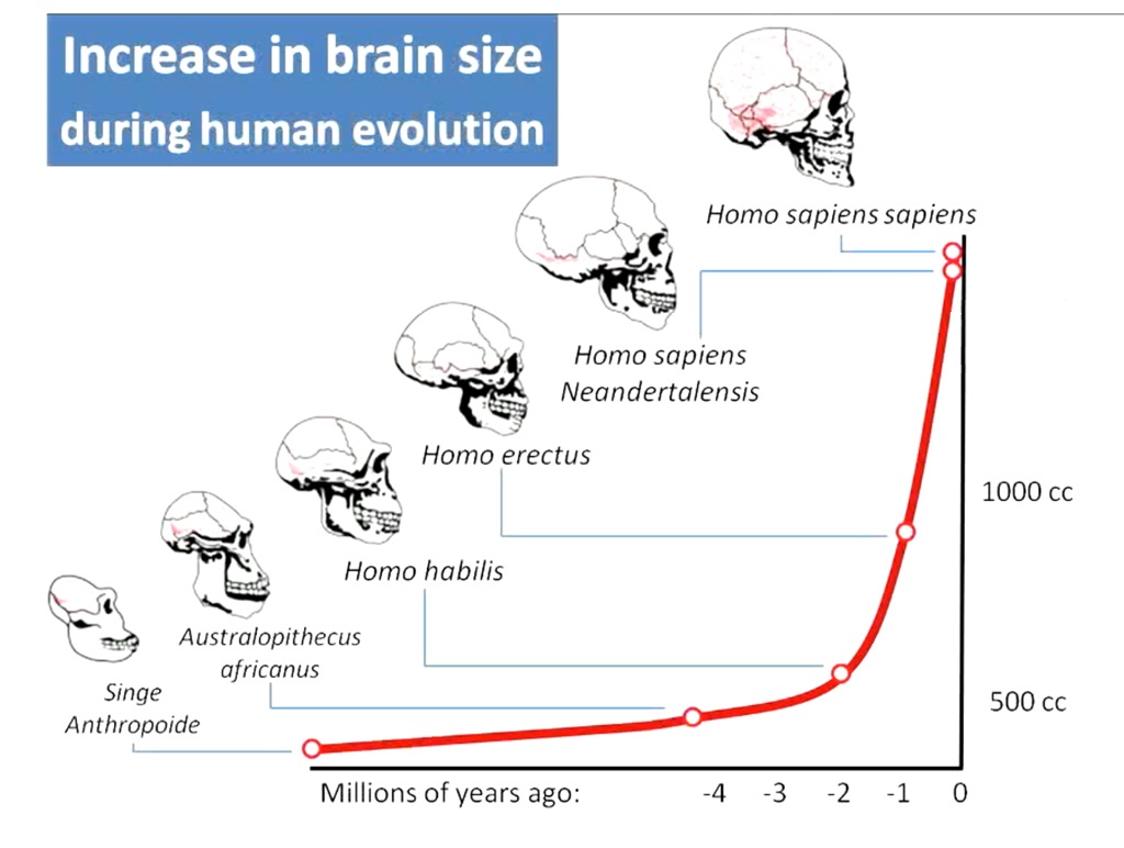 Het meest recente geval van zulk een exponentiële groei aangaande het leven is niet moeilijk aan te wijzen. Hier is de groei van de omvang van het menselijke brein: