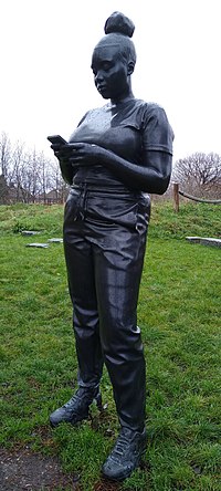 Wat kennelijk heet "Reaching out", maar wat overduidelijk uitbeelt "Cross-culturally dressed woman wonders over sound-and-picture magicbox", of "Anders-cultureel geklede vrouw verbaast zich over beeld-en-geluid toverdoos".