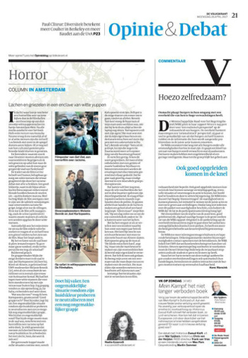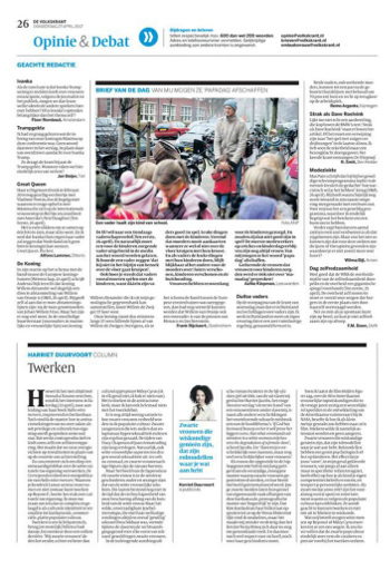 Gevolgd door een column vol identiteitspolitiek. Meer over het specifieke onderwerp, dat boek, later - hier is genoeg om te zeggen dat een boek met de titel "Hallo zwarte mensen" naast Mein Kampf gezet zou worden. Maar hoe kan het ook anders ...? Hij is aangenomen vanwege zijn carrière als identiteits-correspondent ... Net als de volgende figuur, zie de foto rechtsonder, van de op zaterdag volgende maandag (de Volkskrant, 24-04-2017):